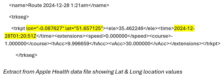 Included, depending on the activity logged, are workout-routes files. These.GPX files contain GPS coordinate data for users’ Activity workout routes. These files can be imported into Excel, analysed as required, and then reformatted as a KML file for mapping software, such as Google Earth, to view the full location activity.